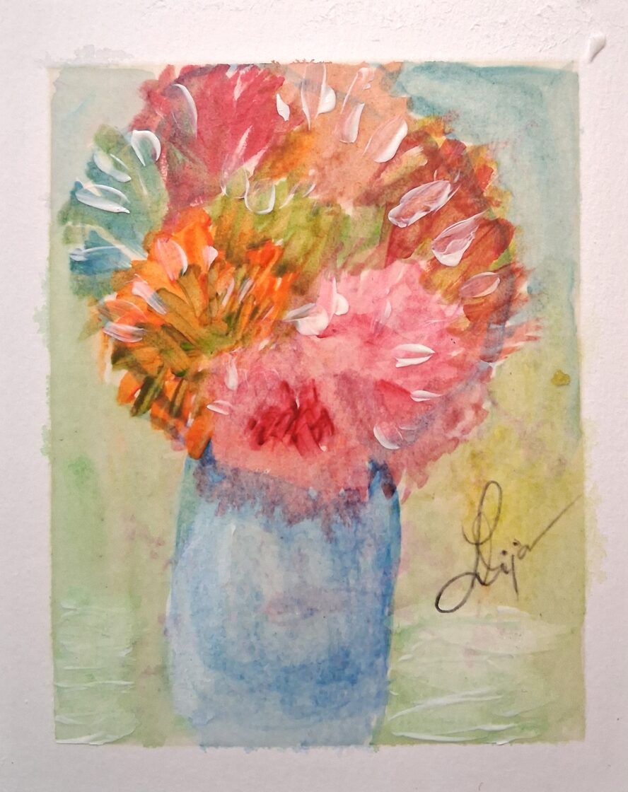 05.09.2025. Gleznojām dālijas! Strādājām ar maziem akmenīšiem, akvareli un akrilu.