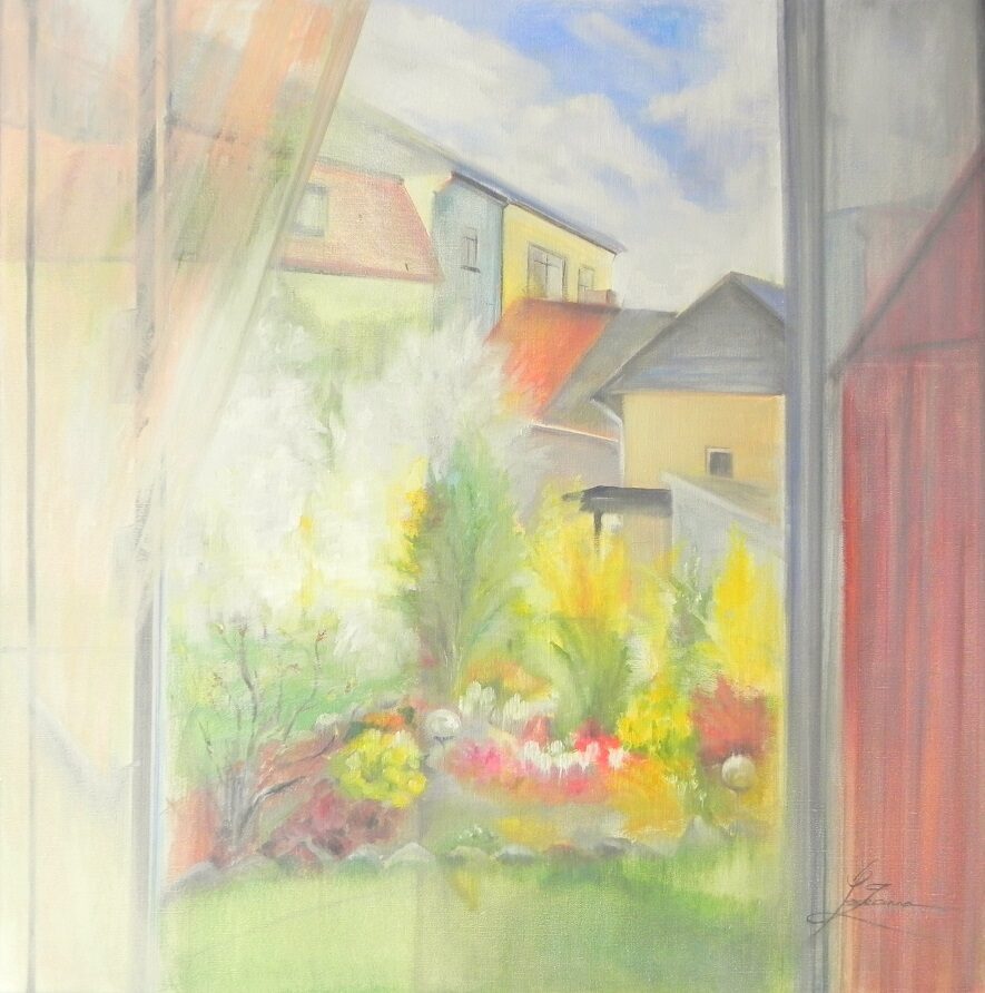 "Pavasaris aiz loga". Eļļa uz kartona. 59x47cm. 2021