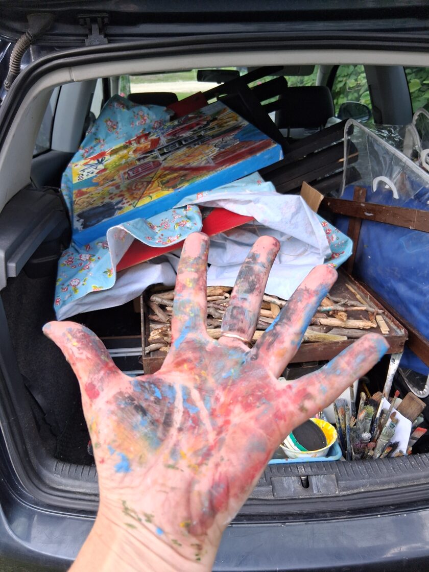 Laimīgs mākslinieks ir mājās! Jākrāmē mašīna laukā!