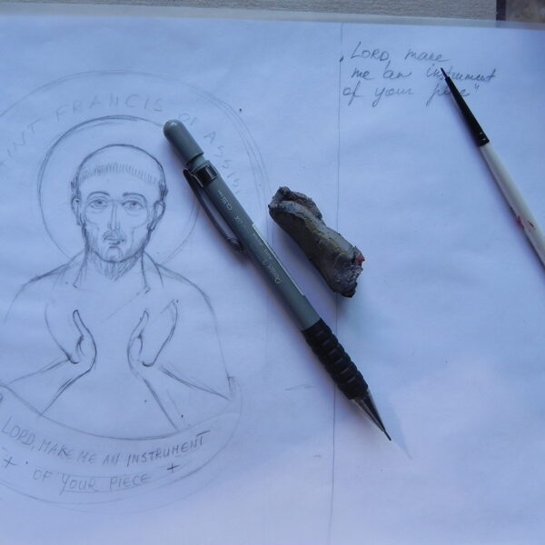- Kartiņas gleznoju uz akvareļu papīra ar pigmentiem, ar olas dzeltenuma saistvielu. Pirmajam darbam, Sv.Francisks, uztaisīju divus variantus: melnbalto ar tušu un krāsaino, lai saprastu, kurš variants labāk patiks cilvēkiem Īrijā.